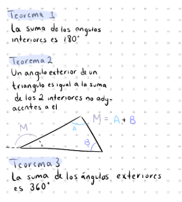 Un ángulo exterior de un triángulo es igual a la suma de los 2 interiores no adyacentes a él.